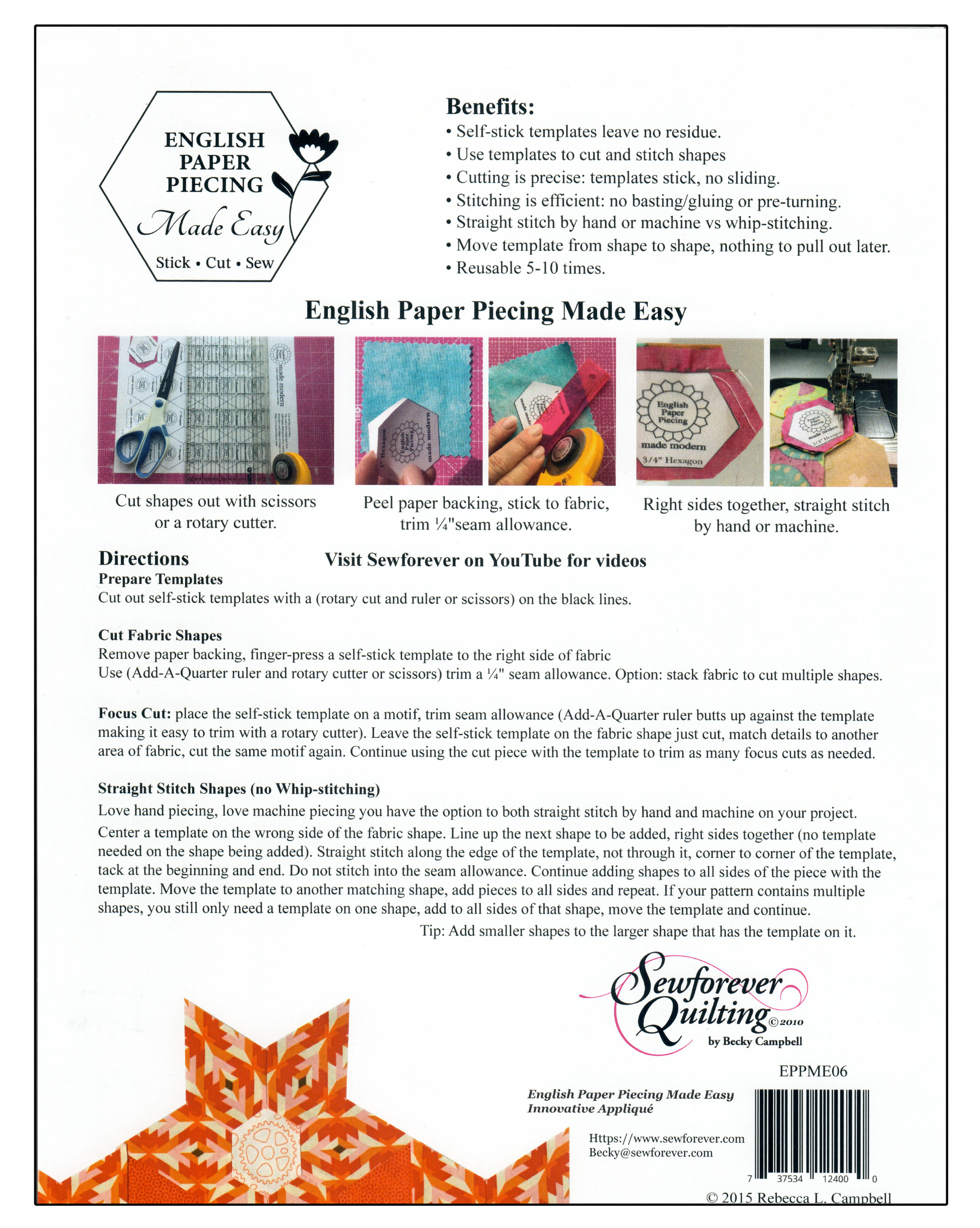 Self stick templates eliminate pre-turning, basting/glue, whip stitching and pulling papers out. Use the templates to cut fabric shapes, including fussy cutting.