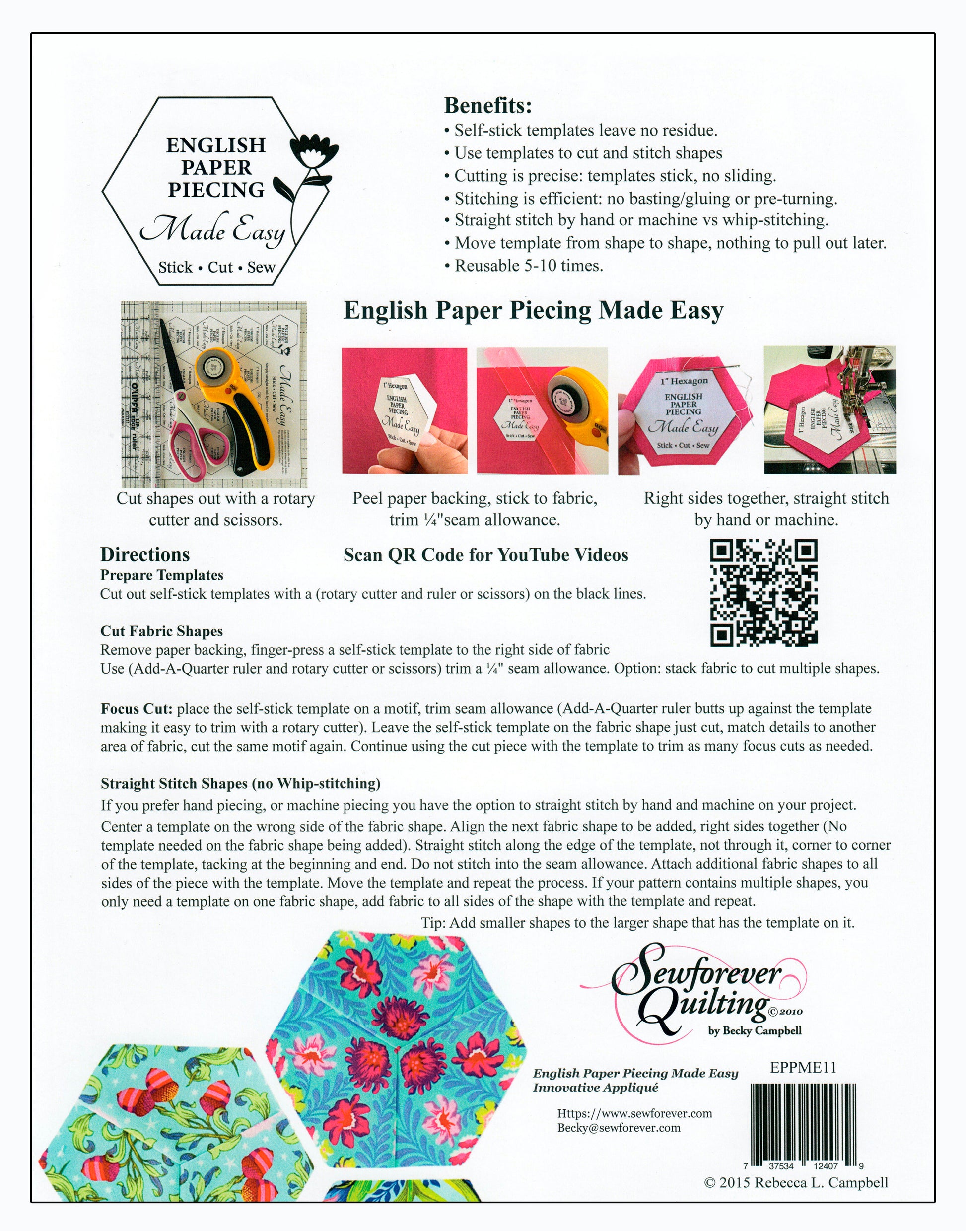 Self-stick templates eliminate pre-turning, basting/gluing, whip stitching and pulling paper out. Use the templates to cut fabric shapes, including focus/fussy cutting.